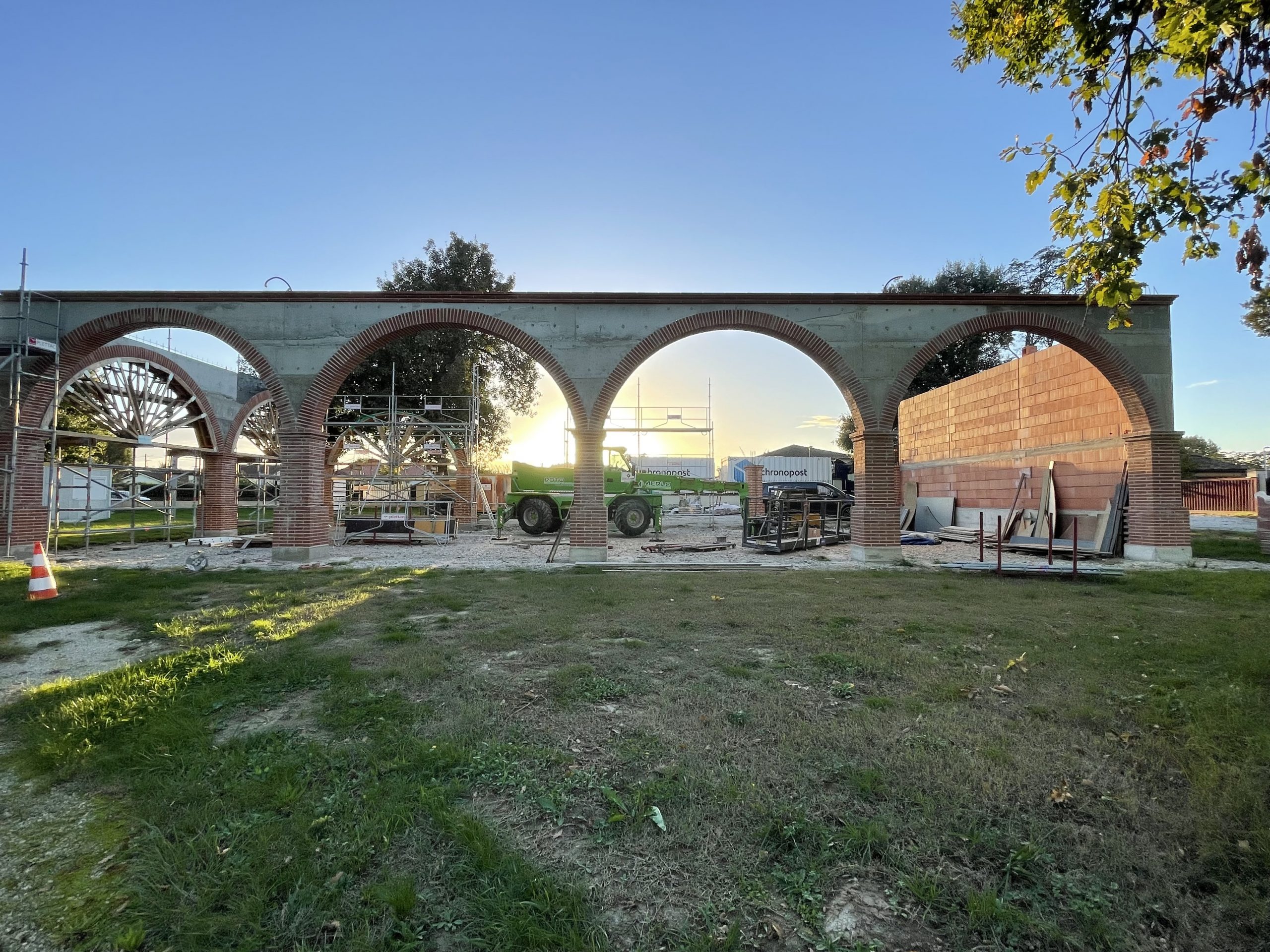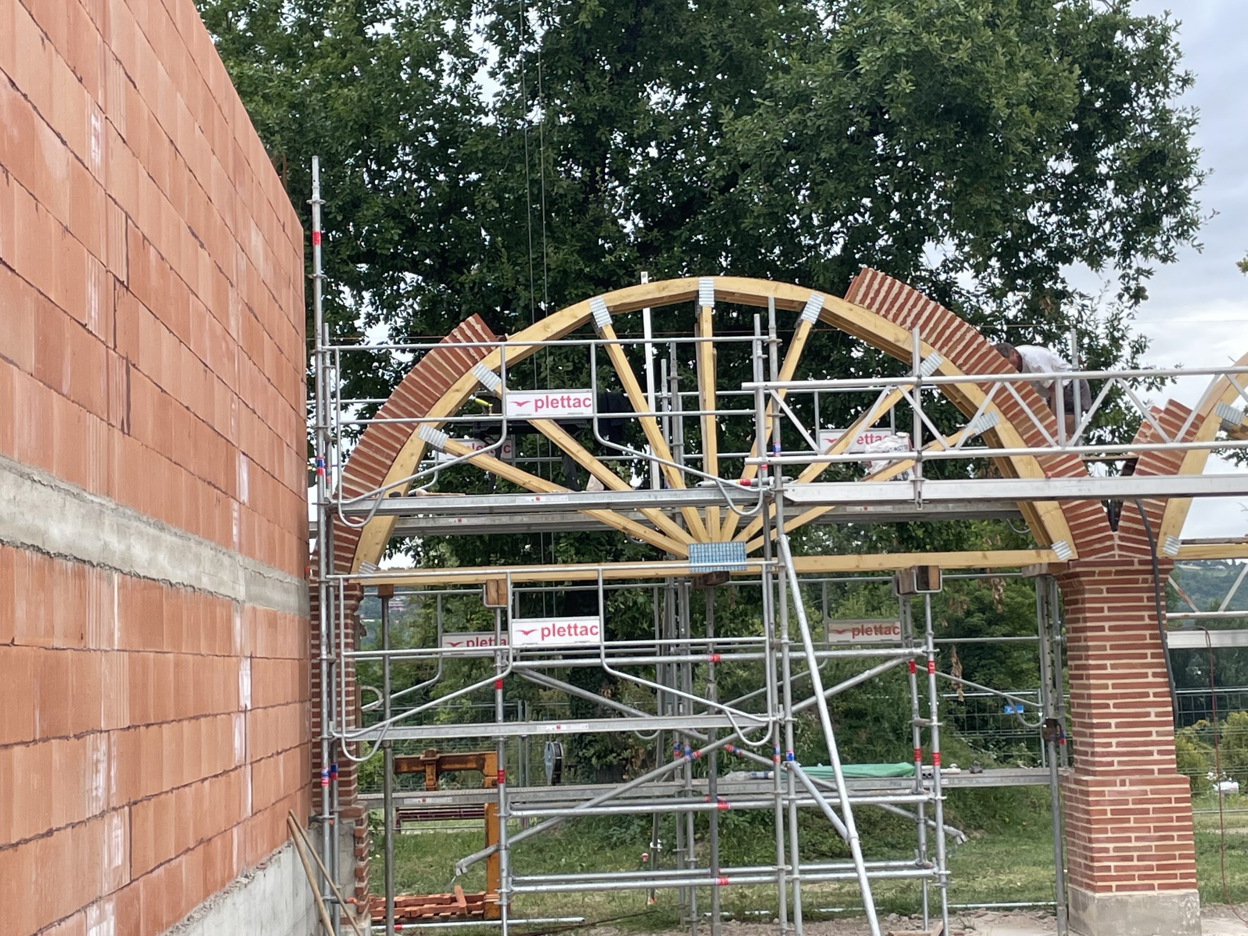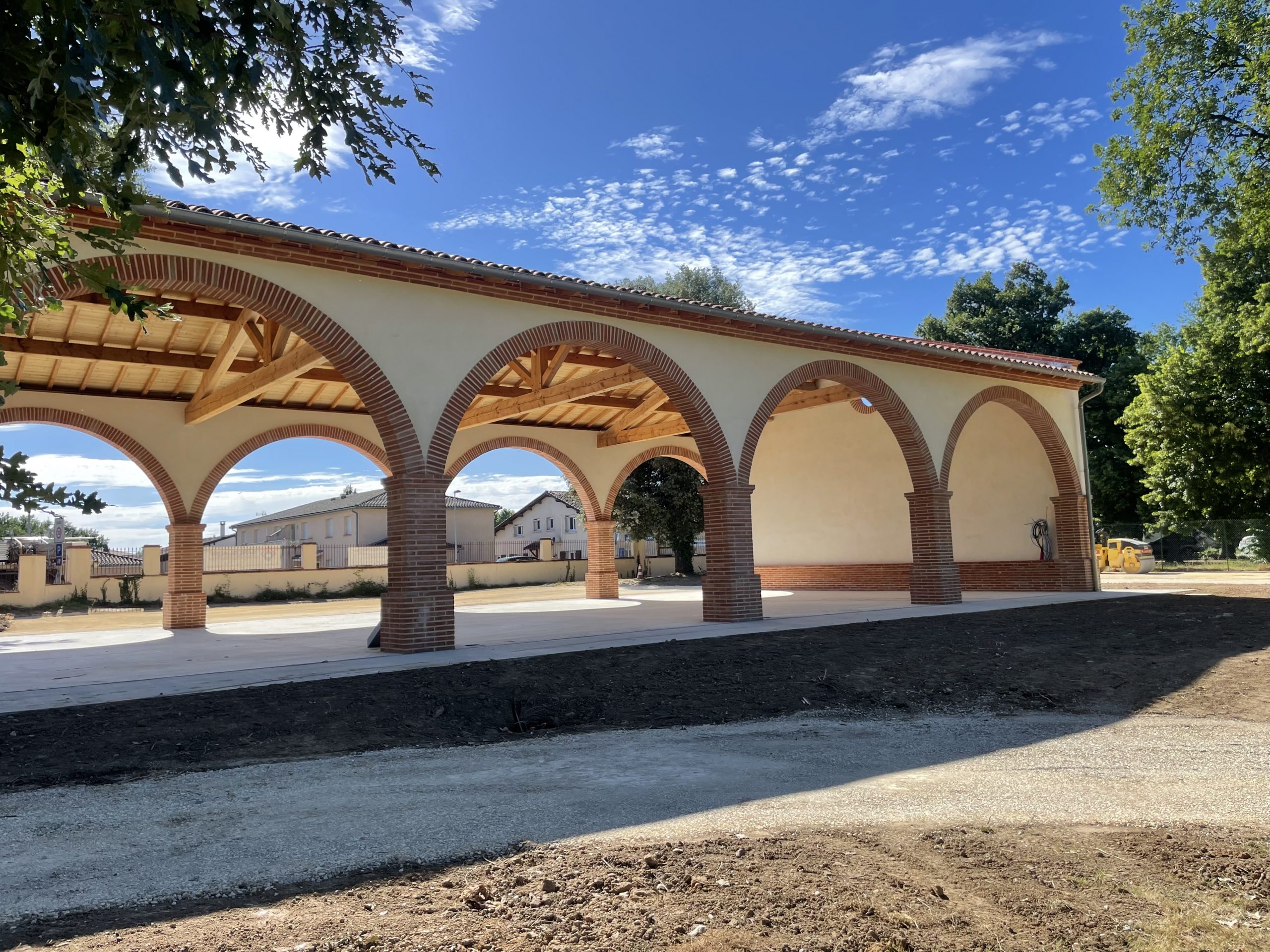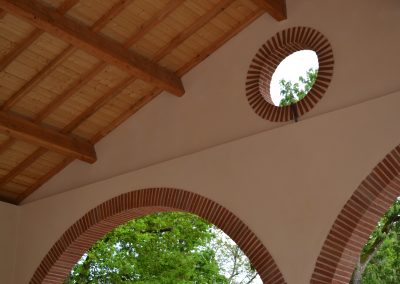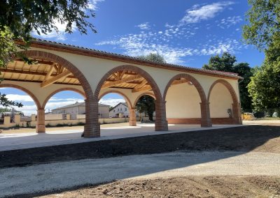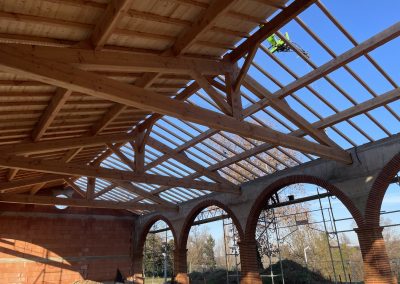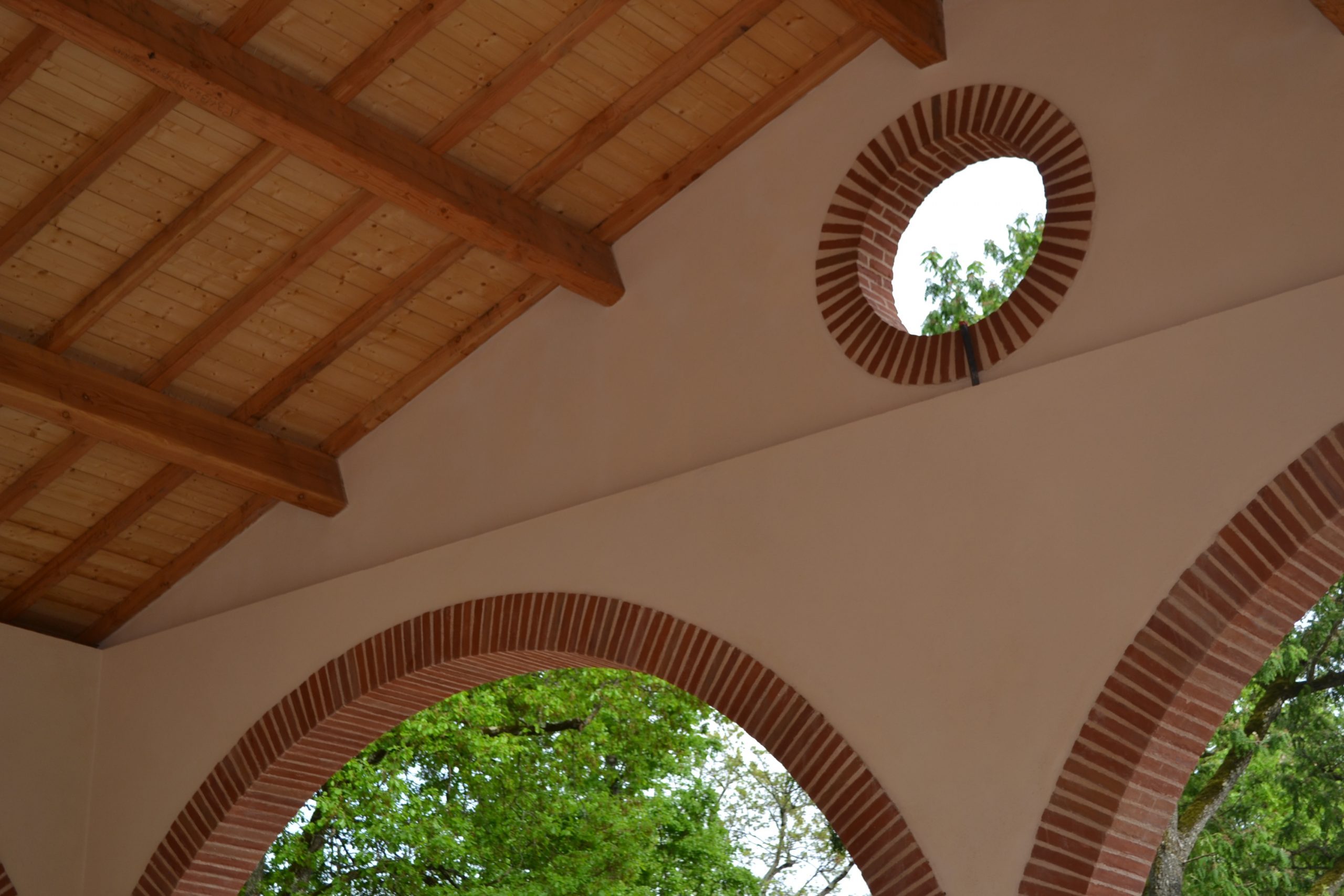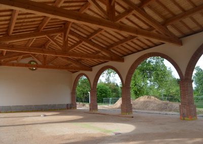 L’entreprise QUADRI a relevé le défi de construire en son intégralité une halle couverture de façon traditionnelle. Les poteaux, les voutes, les corniches ont été bâties dans les règles de l’art, briques par briques à la chaux. La charpente est, elle aussi traditionnelle, coiffée de tuile canal.
