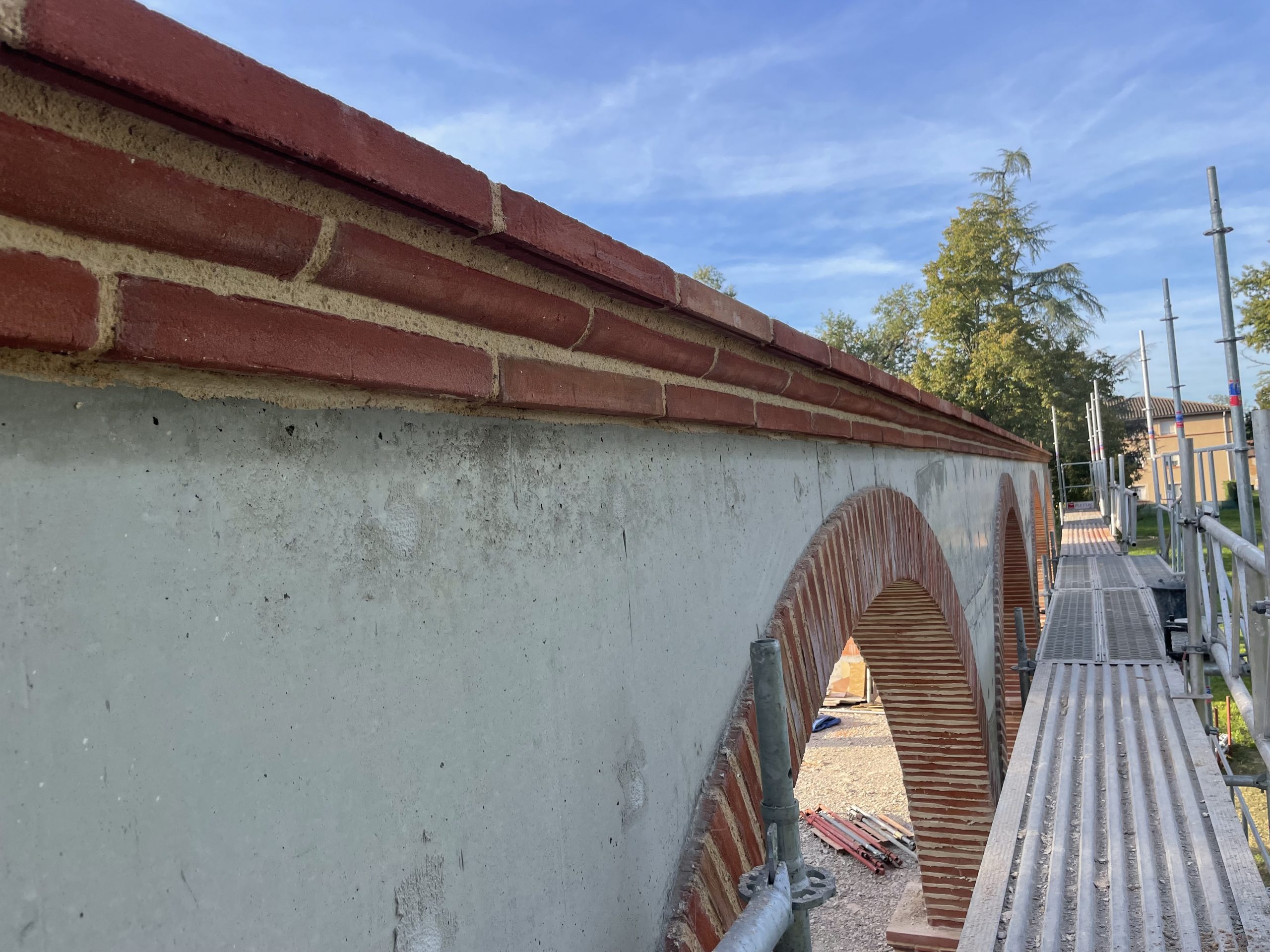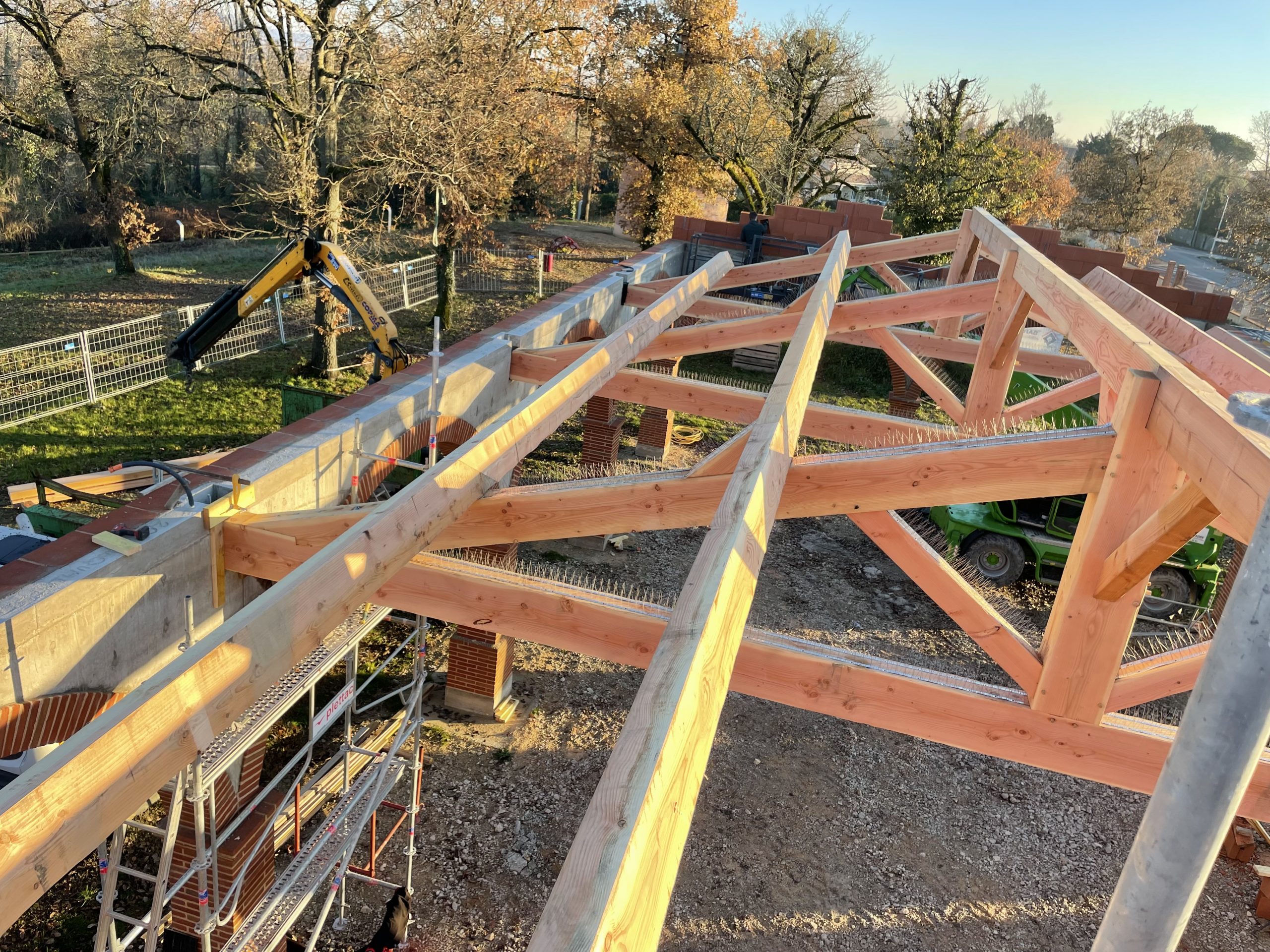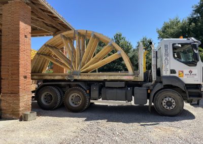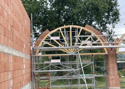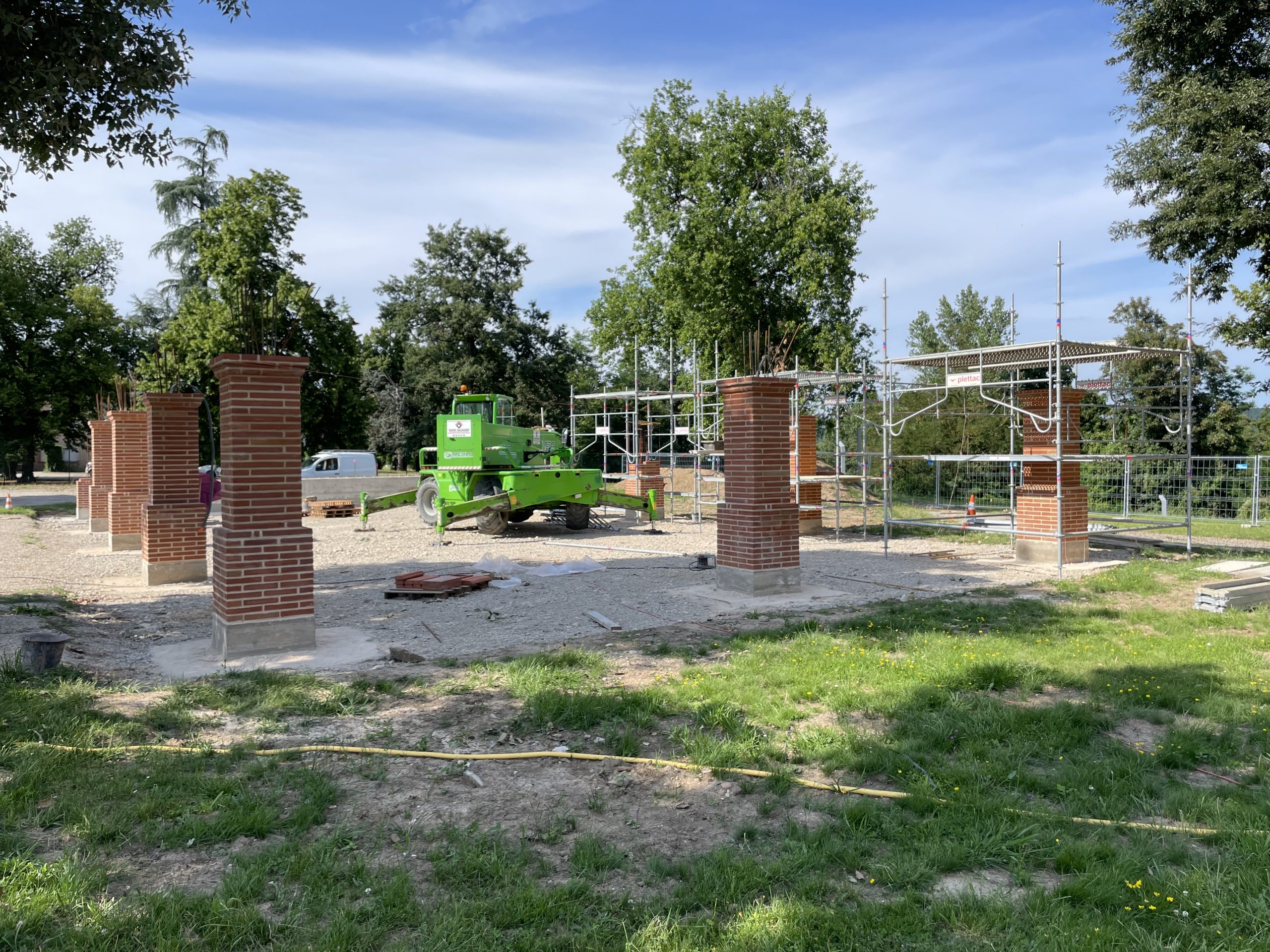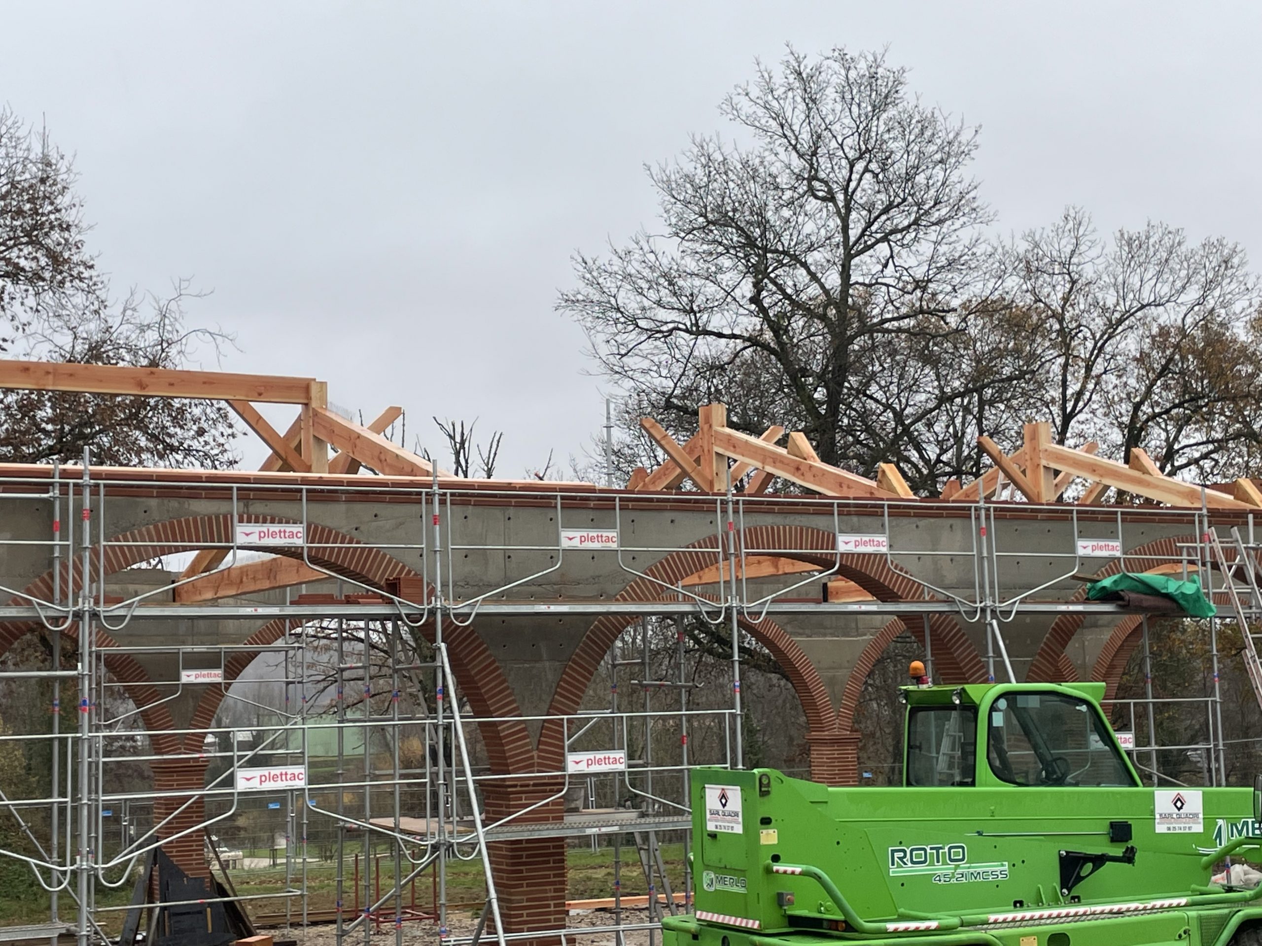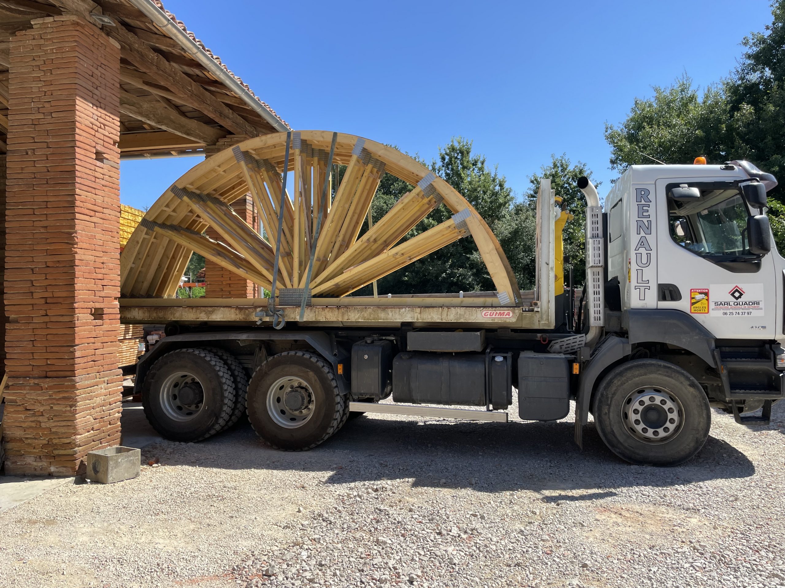 L’entreprise QUADRI a relevé le défi de construire en son intégralité une halle couverture de façon traditionnelle. Les poteaux, les voutes, les corniches ont été bâties dans les règles de l’art, briques par briques à la chaux. La charpente est, elle aussi traditionnelle, coiffée de tuile canal.